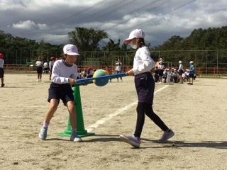 4年生もペア競技です。ボールを2本の棒ではさんで運びます。