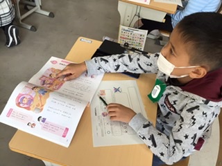 道徳の授業です。部屋のすみにかくれている「なまけにんじゃ」