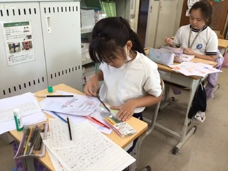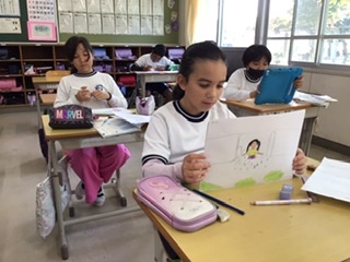 教科書の3種類の絵をもとにして、山場のある物語を考えました。自分でイラストを付け加えて、紙芝居風に仕上げています。