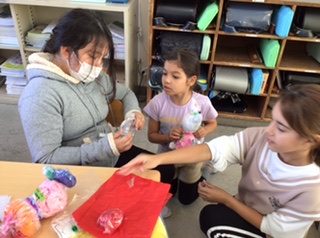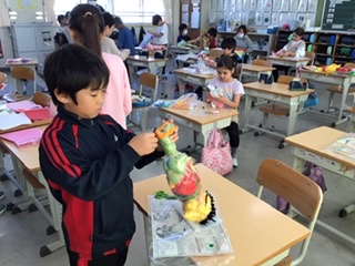 色の組み合わせを考えて袋につめ、それをつなぎ合わせて楽しい友だちを作ります。発想力豊かな3年生。いろいろな友だちが生まれています。