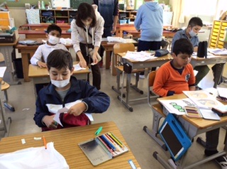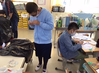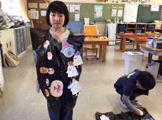 ハロウィンの仮装衣装作りです。イラストに色を付けてハサミで切り、黒いビニールの衣装にテープで貼り付けていきます。