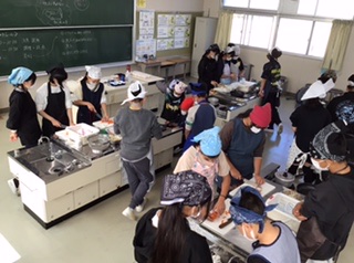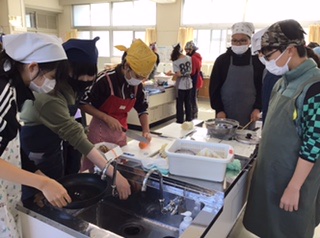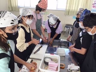 班で考えた、野菜を使った副菜を作ります。スクランブルエッグや野菜炒め、エノキのベーコン巻きなどメニューはいろいろ。時間内に完成できるように、役割分担をして取り組んでいます。