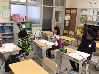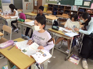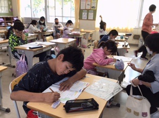 こころ教室では、算数の友を使って練習問題に挑戦中です。問題が解けたら挙手をして先生に知らせ、答えを確認します。みんな黙々と取り組んでいます。