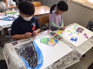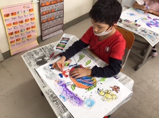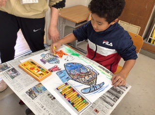 読書感想画の「にじいろのさかな」。今日はクレヨンで色塗りです。カラフルな魚がたくさん登場しています。