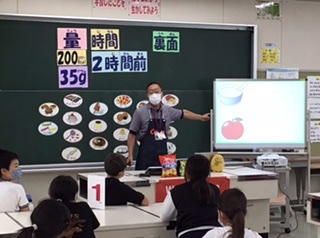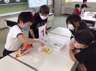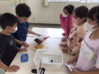講師の方を招いて、「スナックスクール」を行いました。自分達が食べるおやつの量を測って、それが適切な量なのかを学びました。また、食べる時間帯や、どんな食品を取ると良いかも教えてもらいました。