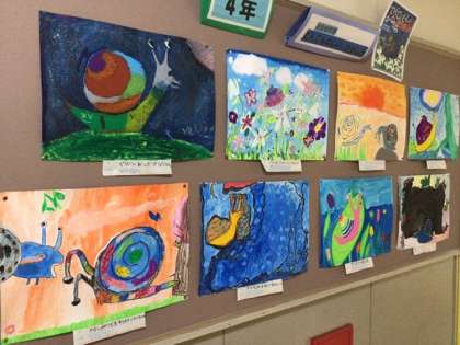 4年生が描いた「でんでんむしの かなしみ」の感想画が掲示してあります。個性あふれるでんでんむしが鮮やかに描かれています。