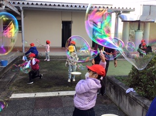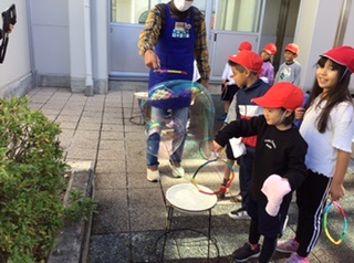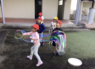 ものづくりサポーターの方をお招きして、シャボン玉教室を行いました。まずは一人ひとり、ハンガーにモールを巻いて、「フラッパー」と呼ばれる道具を作りました。いよいよシャボン玉づくり。少し風は強かったですが、その風を上手に利用して、みんな次々と大きなシャボン玉を作り出していました。