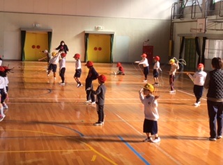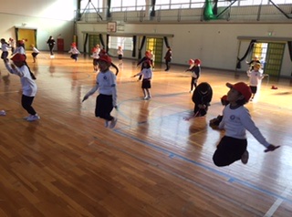 今日の体育は、体育館でのなわとび練習です。まずは前跳びを練習します。縄をうまく回せずに苦労していた子もいましたが、あきらめずに何度も挑戦していました。