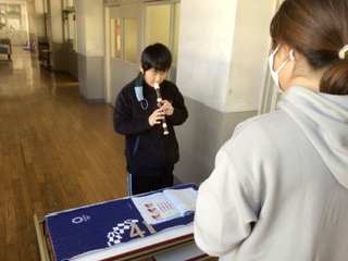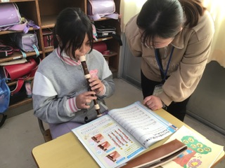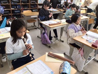 今日は「オーラ•リー」のリコーダーのテストです。自分の番が来るまで、教室で何回も吹いて練習しています。
