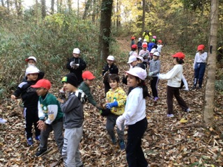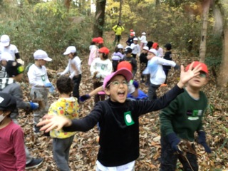 ハローウッズの小道に、落ち葉がたくさんありました。みんなでつかんで、空へ放り投げて楽しみました。もう夢中です。