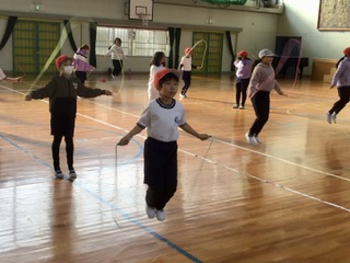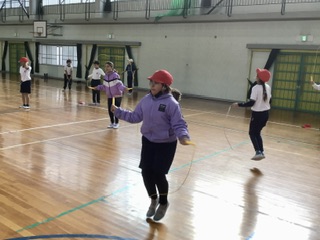 最初にダンスで準備体操をしてから、縄跳びに挑戦です。前跳び、後ろ跳び、片足跳びなど、色々な種類を練習しています。