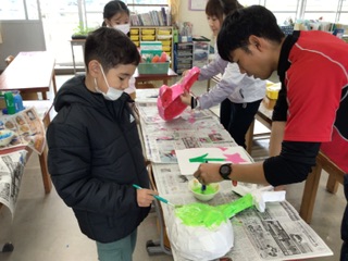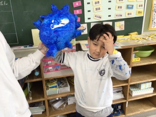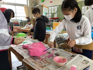 どんな作品にするのか、デザインから考えて取り組んでいるお面づくり。今日は色を塗りました。少しずつ、完成に近づいています。