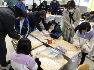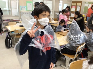 4年生はキッチンペーパーでマスクを、ビニール袋で雨がっぱを作りました。これで雨の日も安心です。