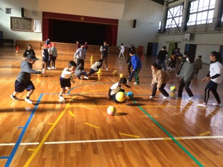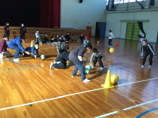 体育館は曜日で種目が違います。今日は「ボールころがし」。時間内に、相手の陣地にたくさんボールを転がしたチームの勝ちです。みんな夢中でボールを追っています。