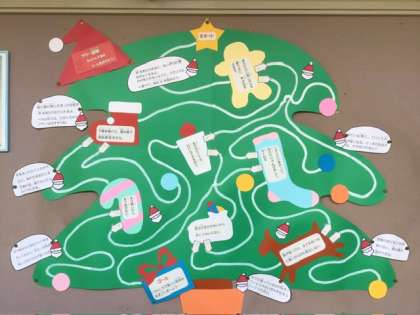 もうじきクリスマス。保健室前に、ツリー迷路が掲示してあります。もう、西保見小のみんなは、挑戦してみたでしょうか。正しい道を選んで、健康で楽しい冬休みを過ごしてください。