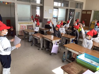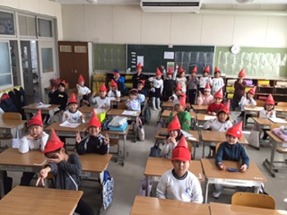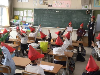 お揃いの三角帽子をかぶってのクリスマス会。スキップ教室の漢字クイズや、ひらがなビンゴなどで楽しみました。