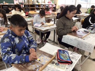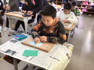 図工で彫刻刀を使います。今日は使い方を聞いた後、持ち方や注意点を聞いた後、試しぼりをしてみました。三角刀や切り出し刀など、順番に使っていきます。怪我をしないように、慎重に進めています。