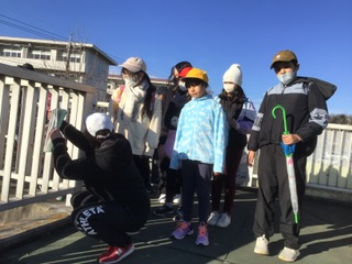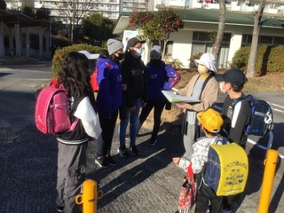 通学班会後の下校では、担当の先生と一緒に危険箇所を確認しました。階段や歩道橋にいる時に地震が起きたらどうするのかも、実際にやって確かめます。