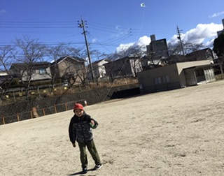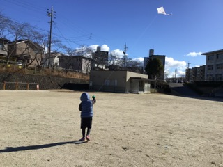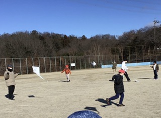 自分たちが作ったビニール凧を揚げてみました。風が強くてコントロールするのが大変でしたが、青空に白い凧がよく映えています。