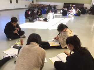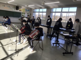 学習発表会で披露する合奏の練習中です。それぞれのパートに分かれて、楽譜を見ながら練習を繰り返しています。本番が楽しみです。