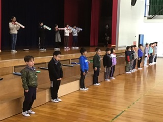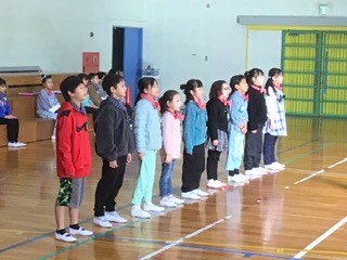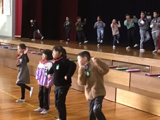 学習発表会、スタートは2年生からです。「ドレミのうた」「かっこう」「山のポルカ」などの曲を、鍵盤ハーモニカの演奏にのせて、元気よく歌いました。最後は九九を言いながらダンスを披露してくれました。寒さを吹き飛ばす音楽会でした。