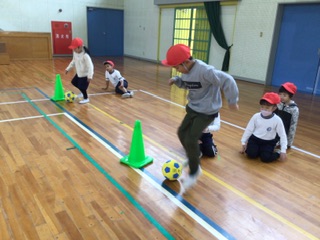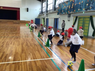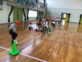 サッカーボールを使った運動をしました。ボールを何度か足でタッチした後、決められたコースを走ります。ボールが動いてうまくタッチできない時は、同じ列の子が手でボールを押さえるなど、協力する姿も見られました。優しい1年生です。