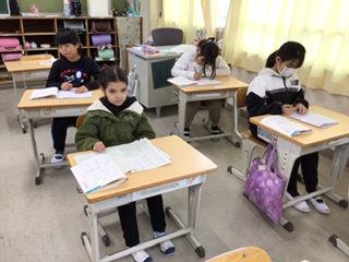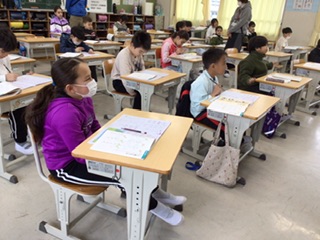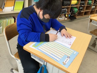 今日の書き方は鉛筆です。漢字の「はね」や「はらい」に気をつけて、ノートにていねいに練習していきます。