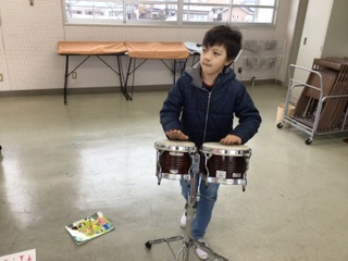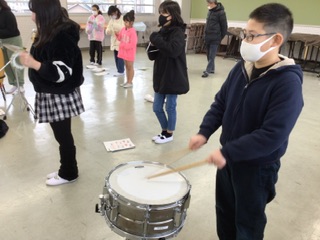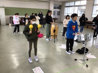 今日から登校再開の2組は、音楽づくりに挑戦です。打楽器を使って、音を徐々に大きくしたり小さくしたり、リズムを刻んだりします。息がぴったりの2組。ドラムロールのような音が音楽室いっぱいに響いて、とても素敵です。
