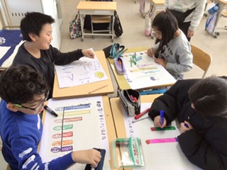 インタビューをして集めた意見をポスターにまとめ、発表の準備をしています。テーマは「キャラクター」「ゲーム」「スポーツ」などです。
