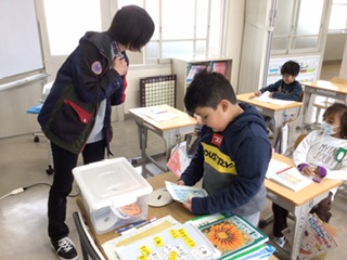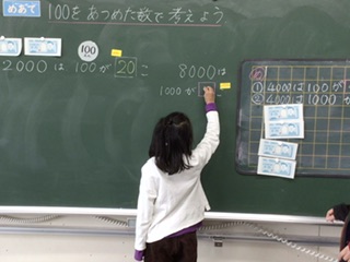 大きな数を、100や1000のかたまりを使って表しています。良い姿勢で手をあげたり、前に出て意見を発表したり、みんなとても集中して勉強しています。