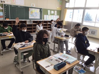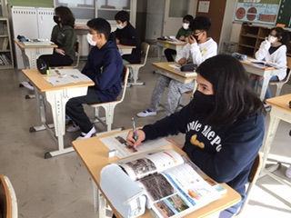 こちらの教室では、原爆について勉強しています。教科書や資料集の写真を見て、どのような影響があったのかを学んでいます。