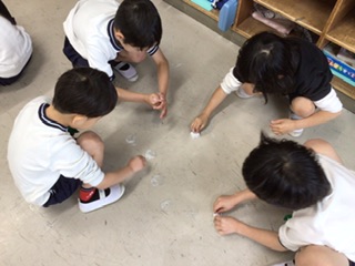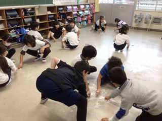 みんなで床磨きです。広くて大変ですが、磨いたところはとてもきれいになっています。教室をぴかぴかにするため、全力で頑張っています。