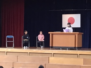 全校が体育館に入り、修了式を行いました。1、3、5年生の代表の子が作文発表をしましたが、大きな声で堂々と行えました。学年代表として修了証を受け取った子、表彰を受けた子、話を聞いている子、みんな素晴らしい姿勢でした。