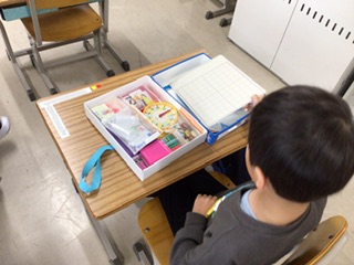 今日は算数セットを開いてみました。数え棒や時計など、色々なものが入っているのを発見しました。おはじきなど細かなものまで名前を書いてくれた、お家の方に感謝です。