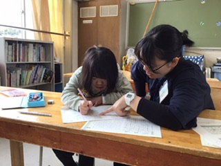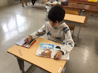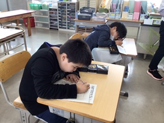 それぞれの席で、前の学年で習ったことを復習しました。早く終わった人は、塗り絵をしながら静かに過ごしています。