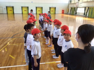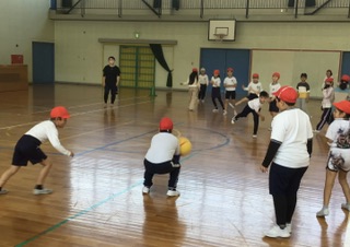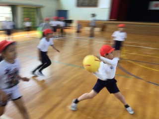 体育館でドッチボールをしました。当たった時には、ちゃんと自分から申し出て外野に移動していました。みんな元気いっぱい動いています。