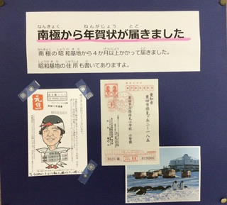 去年6月に「南極クラス」を4年生が行いました。そのご縁で、なんと南極から年賀状が届きました。1月1日に、南極の昭和基地から出された年賀状を、南極観測船「しらせ5003」が南極から持ち帰り、帰国後に国内で郵送したそうです。4か月もかかって届いた年賀状。南極の遠さがよくわかります。