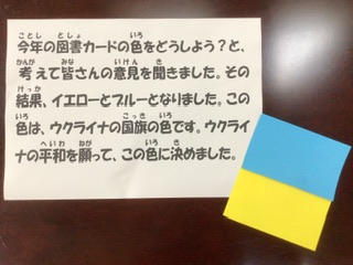 今年は何色のカードにしようと考えていた司書さん。4、5組のみんながアイディアをくれたそうです。「みんなにアンケートを取ったらどうかな」「みんなが幸せになる色だといいよね」などなど。