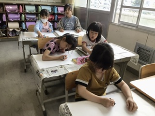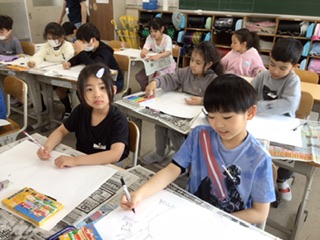 図工の時間です。ぽかぽか陽気の今日、春の自然の様子を知るために、運動場や花壇を見てまわりました。その後、春の植物に囲まれた自分を絵で描きます。どんな絵になるのでしょうか。