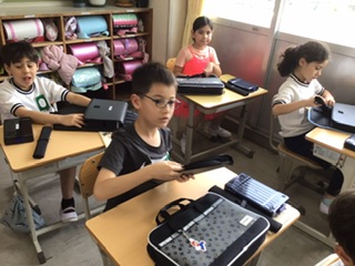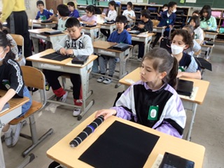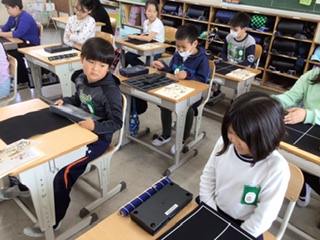 3年生から毛筆が始まります。初回の今日は、筆で書くとどんなふうになるのか、先生が書いた字を見て考えました。そしていよいよ習字道具をセットします。すずり箱や下敷き、筆、文鎮などを出して、机の上に置いてみます。
