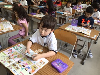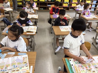 算数セットのブロックを使って、1から5までの数字について勉強しました。