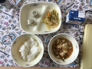 やさいいりしゅうまい2こ バンサンスー ごはん とうふのちゅうかに ぎゅうにゅう です。