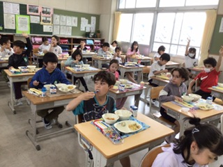 3年生の教室では、給食当番を中心にてきぱきと配膳をしていました。