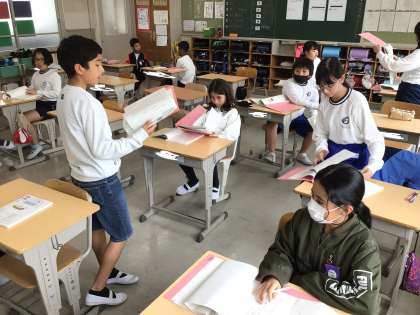 音読発表会に向けて、練習を頑張っています。主人公の心情を音読記号で示し、読み方を変えて表現しています。土曜日の授業参観で発表する予定です。楽しみにしていてください。