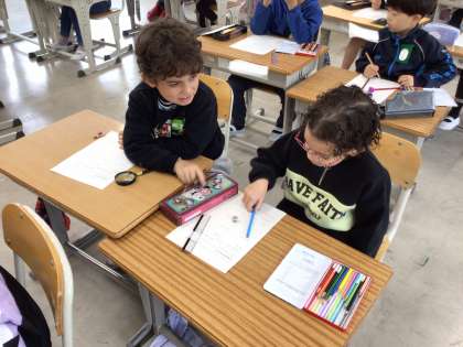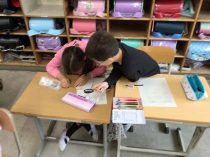 ホウセンカの種を虫眼鏡で観察しました。来週種まきをする予定です。