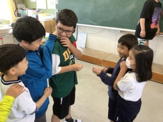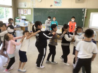 今年も縦割り班活動が始まりました。6年生の指示にしたがって、自己紹介をしたり、じゃんけん汽車ポッポをしたりして楽しみました。みんな笑顔です。