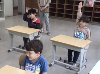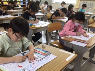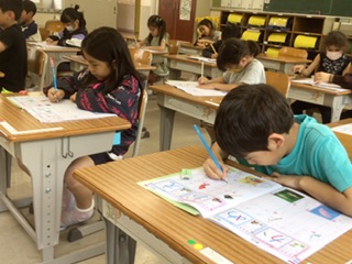 1年生の国語です。ひらがなについて、書いたり発表したりして学習を進めています。