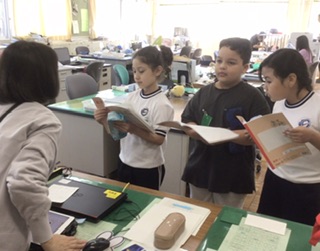 聞いたことをメモする学習です。好きな色や勉強について先生にインタビューをして、答えをメモに取っています。しっかり聞き取って書けたでしょうか。