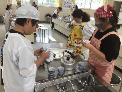 家庭科の学習で緑茶をいれる学習を行いました。とてもよい色の、綺麗なお茶をいれることができました。校長先生や職員室にいらっしゃる先生にもふるまいました。大好評でした。