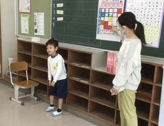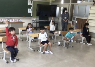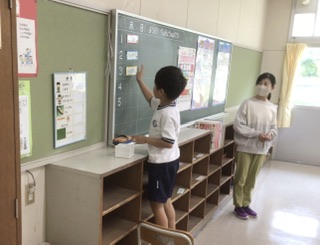 今日は何時間目にどの教科を勉強するのか、時間割を見て確かめました。後ろの黒板に、教科名をはっていきます。